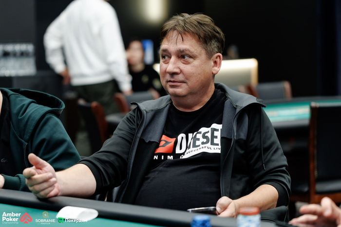 Игорь Поляков выигрывает раздачу, собрав пару троек.