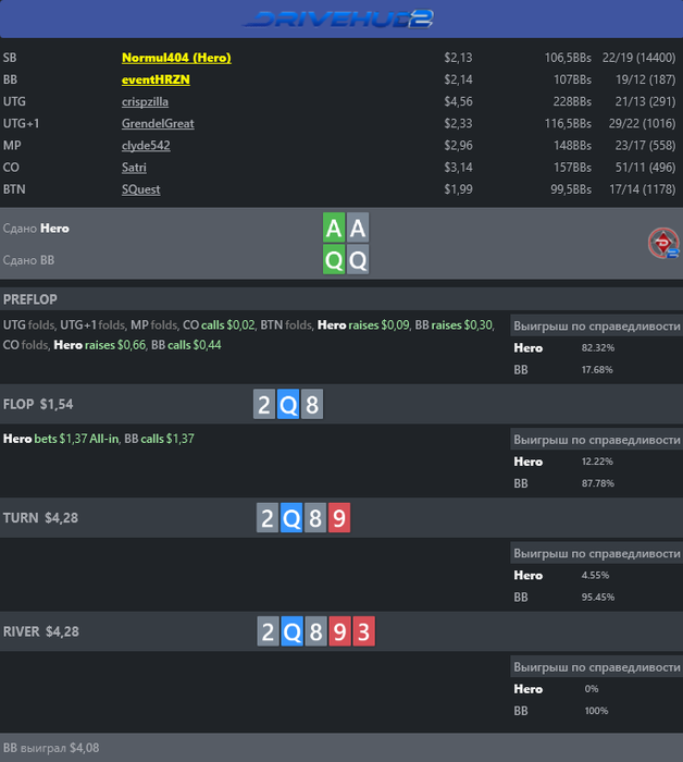 Forsee, Этo да, хотя когда я нажимал колл я был уверен, что действие плюсовое ведь у меня пол колоды аутов. Вся собака зарыта в том, что я не посчитал количество именно комб, там сетов больше чем ФДшек, там одних шестёрок 9 комб + столько же четвёрок, девятки в 3 бете, но пусть какое-то количество будет и в колле. Это больше 20 комб суммарно против ФДшек которые можно пересчитать по пальцам руки. Хотя в моменте сеты я не закладывал.