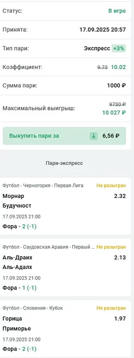 Результаты за вчера 18.09.25. Догон 1 выигрыш на втором шаге, 2 выигрыша на первом шаге, начинаем сегодня с первого шага, банк увеличился на 6340 ₽, итого 520 585₽, +45,41%! Флет лайв 26 матчей, банк увеличился на 7900 ₽, итого 177 400 ₽, +77,4%! Экспресс 10+ из флета, банк увеличился на 680 р, итого 210 545 р,+110,545%. Лесенки исключаю из отбора, околонулевая доходность неинтересна на фоне таких показателей по другим системам.