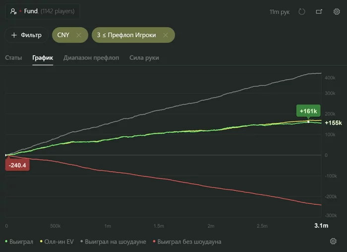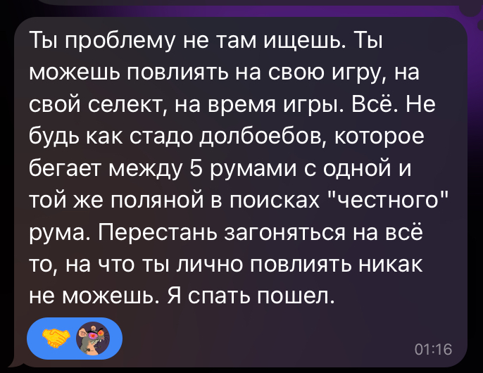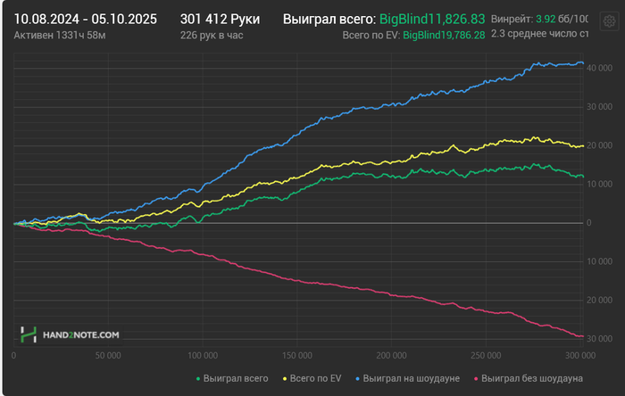 Тренер кинул скрин через х2н4,там у меня 6евбб а по кассе 5бб (на 230к выборке) следовательно ев коряво считается в 3ке и я ебучий лоускилл который играет нл50 в 5евбб. Отключаю ев линию и иду гриндить теорию. Позор мне. очень стыдно стало за посредственную игру. Пока 8бб/100 не сделаю хотя бы - регом называть себя не могу