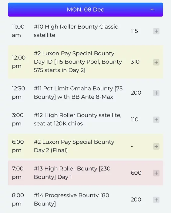 Monday starts with satellites on High Roller, PLO Bounty, the final of Luxon Pay Special Bounty and the debut of High Roller Bounty Day 1!