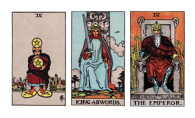 Первая карта – Четверка Пентаклей. Символизирует она осторожного в финансовых вопросах человека, стремящегося к сохранению и накоплению ресурсов, а также крепко держащегося за то, что есть. Удивительно, но это довольно точно характеризует тот аспект моей личности, который я недавно описывал в посте про девяностые.