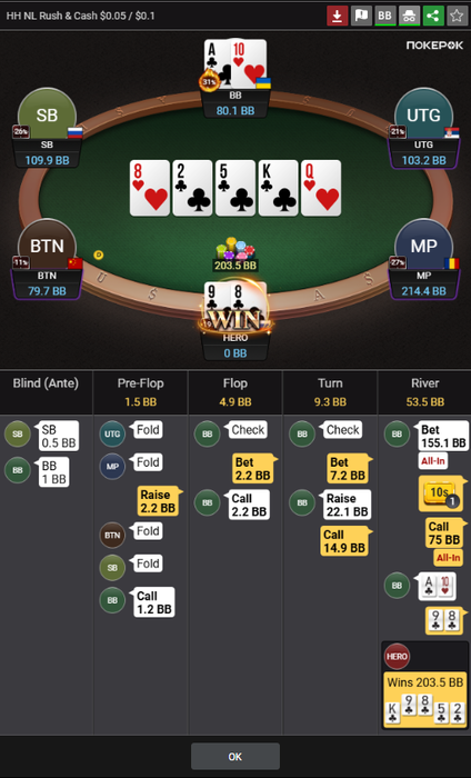 Эмм... 87s, Q8s, Q7s, Q6s... А вот рук сильнее у него не так много... Их там по риверу и не должно вообще быть... Так что у нас там натс можно сказать...