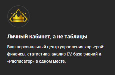 Вот еще цитата - "Ваш персональный центр управления карьерой: финансы, статистика, анализ EV, база знаний и «Расписатор» в одном месте."