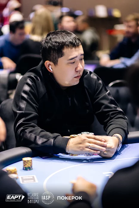 Блайнд на блайнд. Давит Халатиани (625,000) запушил , чиплидер Темирлан Жакенов (2,300,000) уравнял с .