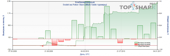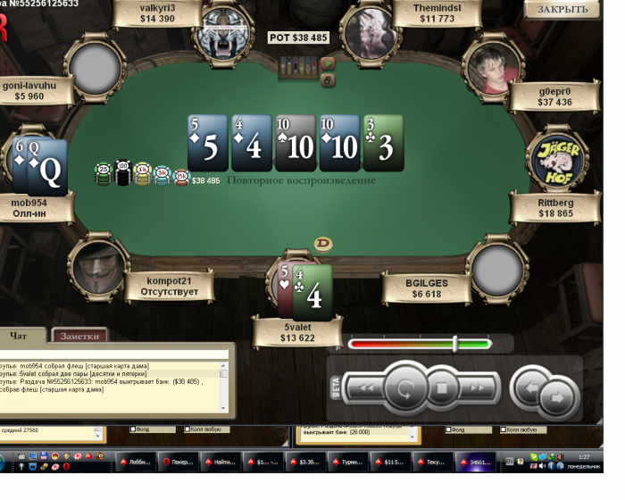 Всем доброй ночи! Решил поиграть! Играю 3.30$+R - 60000$ Пока 173 из 702 тел. 107800 фишек при среднем стеке 79300фишек! Уже в ITM! GUA и 11$ - 20000$ GUA! АУТ оллин префлоп QQ-AK Всем удачи и фарта побольше! Пожалуй зайду еще в один турнирчик: 11$ - HU Knockout TURBO 1 выбил и 5$+ Еще 1и 5$+АУТ А6 против Q10!)