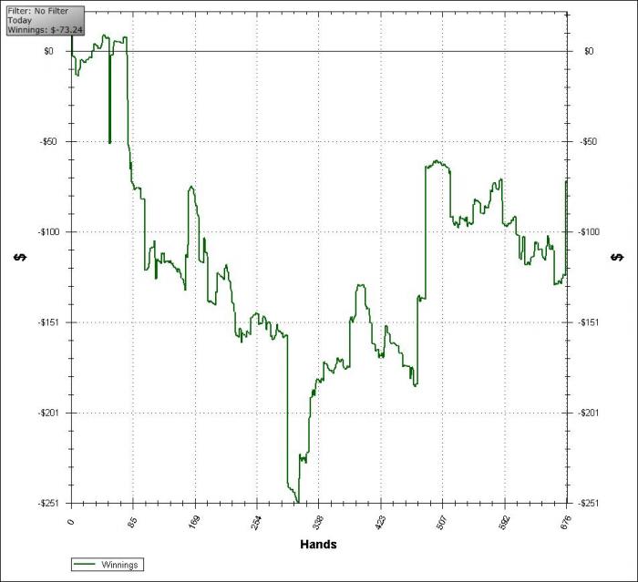 выловил невероятный апстрик на Ipoker и долблю месяц с 24бб на 100. Очень вовремя апстрик, если честно. Жаль, что от бекера. Ибо проигрывал до этого свои. Чуть-чуть напрягает режим: параллельно работаю в универе, пары в универе только 1 и 2-ая в 4 дня, а основная игра происходит для моего часового пояса с 12 ночи. Вот и начинаю иногда долго подбирать слова на парах и не мочь сделать простые логические выводы. За семестр уже успел 2 раза отменить пару (1-ый - приболел, второй - играл турнир до 7 ночи, а пара была в 8.40. Встав в 8.10 понял, что лучше не идти).