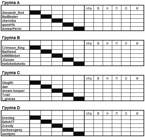 Далее..в призах 6 человек, 4 5 и 6-е места получают обратно БИ! остальной фонд призов делиться следующим образом: 1 место - 50%, 2-е место -35%, 3-е место - 15%! парни, если согласны все, плюсаните плиз пост Миши ( БэдСид )....и все, кто в списке зелёненький ( кроме Батраза ), оплачивайте пожалуйста взнос, всем напоминал в ЛС!