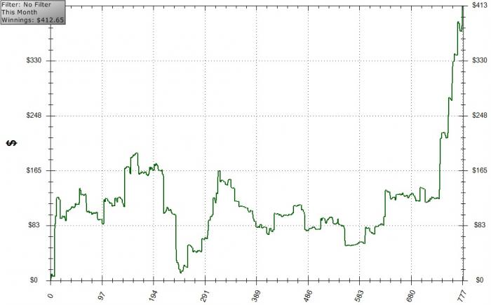 В целом месяц идет хорошо по профиту, но просто ужасно по количеству отыгранных рук. Сначала майские праздники... Потом просто хорошая погода. А тут еще и велозаезд в честь Майской прогулки. Все это породило сразу несколько дней простоя. Плюс сейчас еще и игры почему-то меньше. Надо каким-то образом поднапрячься и постараться отыграть хотя бы 40к рук в мае.