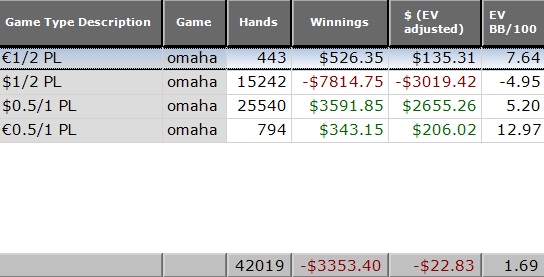 Я могу задепать денег, чтобы был бр на пл200, но смысла в этом пока не вижу. Я же, блин, не выигрываю там. Поэтому я решил, плотно и старательно отработав июль, бросать омаху, если сумма по ЕВ не будет превышать 5к. Я уверен, что сейчас точно бью нл200 холдэма, и, скорее всего, нл400. Время проходит, хватит его терять.