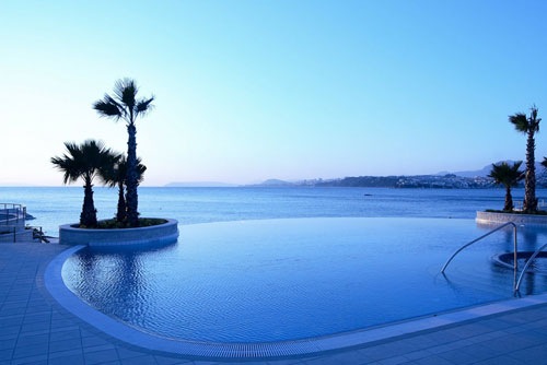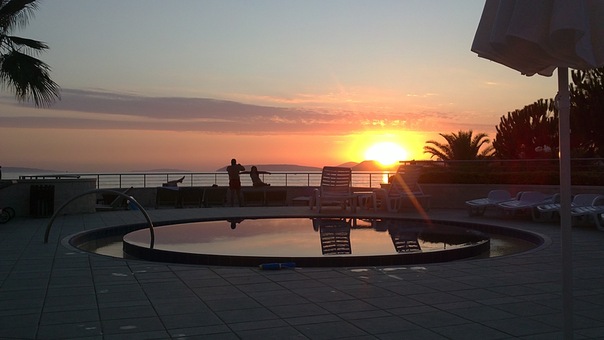 Фото бассейна, моря и заходящего солнца: