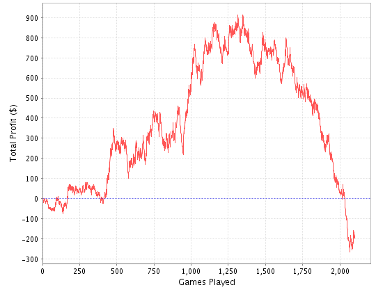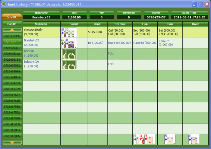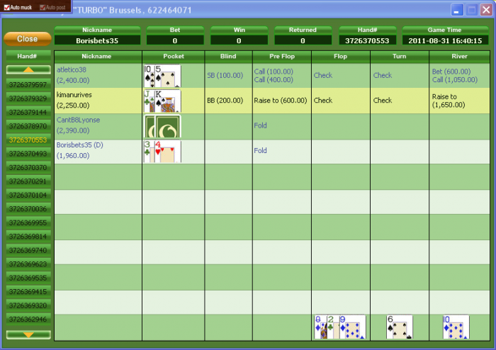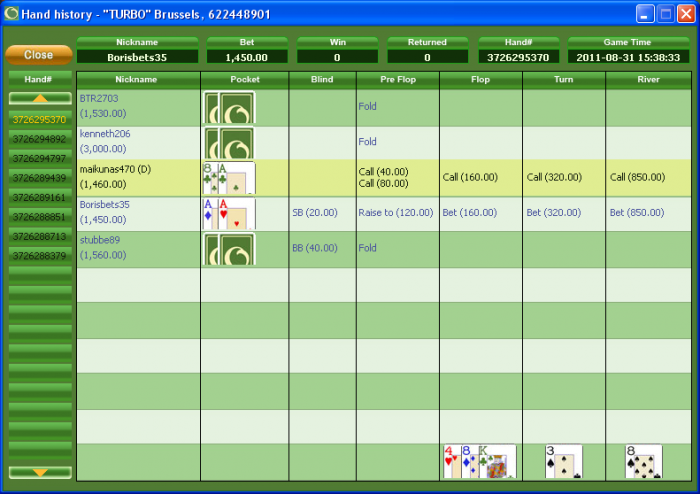 2 раза проиграл на баббле AA<KK b 99<22 за огромные стеки зато ЕВ пошла вверх местный нит, узор считатет, что он хорошо играет на баббле, еще и очень хорошо играет в алынах. остался с 30 фишками и выиграл 4 тройных алына. еле выгнали его.