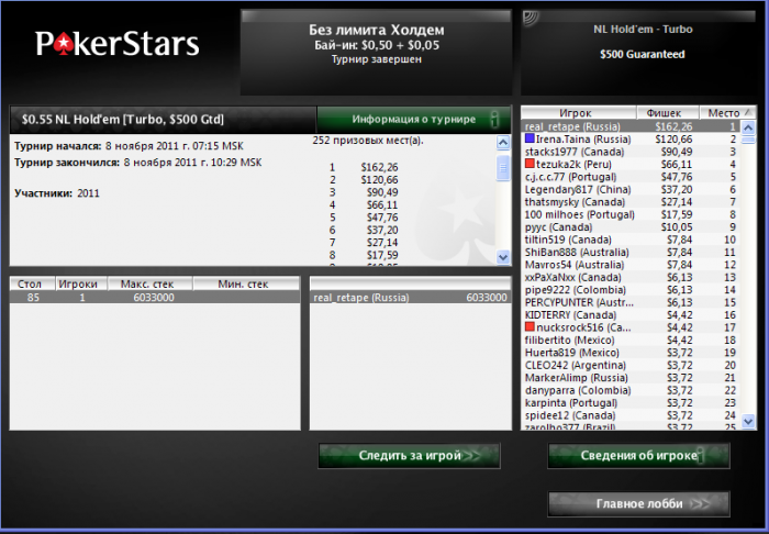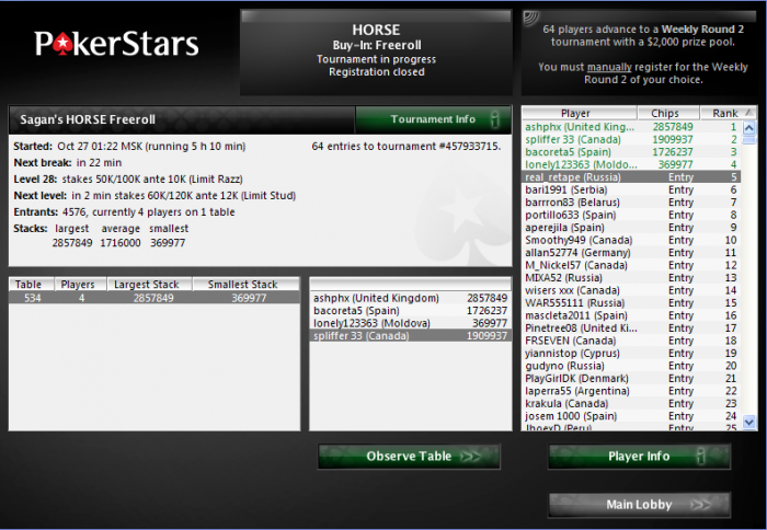 Poker Stars $10/$20 No Limit Hold'em - 6 players