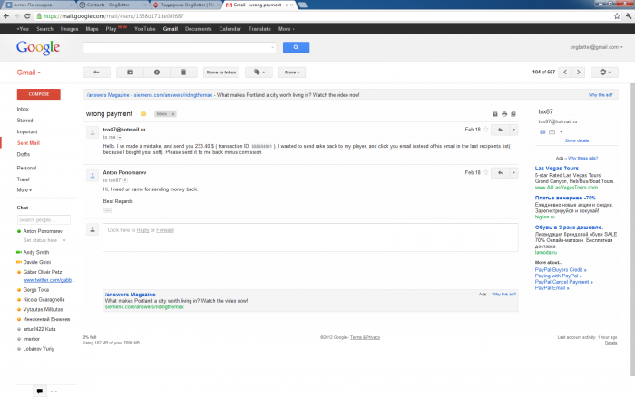 Всем привет! Решил что стоит об этом написать. Может общественность поможет. 15го февраля 2012 года я отправлял рейкбек игроку, но по ошибке выбрал почту из списка последних отправлений не его, а автора данной программы ongbettor, так как до этого ее покупал. Заметил это 18го февраля, и сразу написал на почту ongbetter@gmail.com об этом. Но ответа до сих пор не последовало, так же как и возврата денег.. Вот не знаю что делать даже. На фото доказательства.