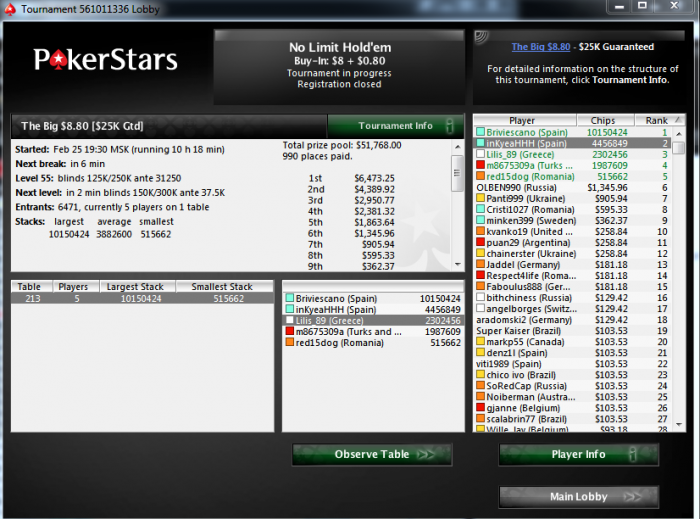 Сегодня вгрузил 200 долларов в сессию, сыграл в 0, был далекий проход в ребайнике по 11, был вторым стеком когда оставалось 60 тела, но сначала раздали на блинах QQ v KK, за средний стек на финалку, распихать не получилось, 34 место и ГГ.
