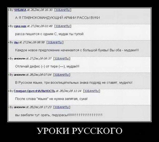 Конечно форумное общение не предполагает соблюдения всех правил пунктуации и грамматики, но некоторые грамматические ошибки откровенно режут глаз. С запитыми так вообще гемор, их реально хрен все поставишь, для себя когда то давно решил, что буду ставить хотя бы те, от наличия или отсутствия которых будет меняться смысл (ну типа как в том всем известном "казнить нельзя помиловать" )