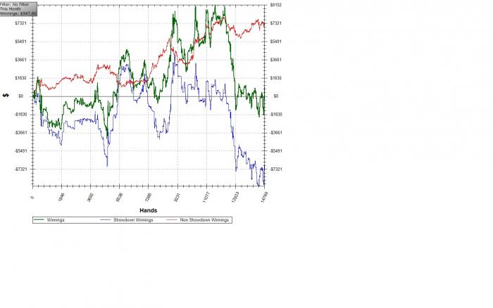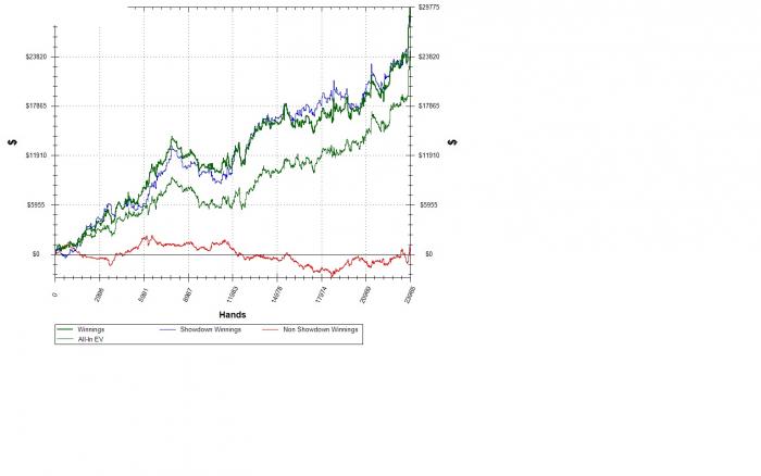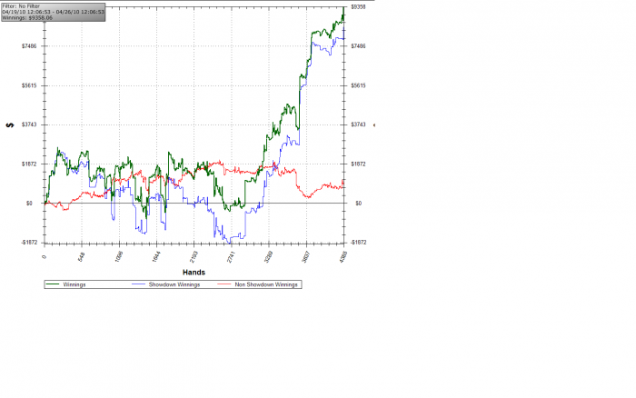 А аллин ев пишет, что все нормально, так и должно быть :( Борьбу с hitandrunner'ами тоже провалил. Садится ко мне такой *****, я точно знаю, что он будет в первой раздаче ставить 3бет аллин, только он идиот и садится за стол с полным стэком. Я подумал, что выгодно сыграть с ним одну раздачу с таким нотсом, я буду закрывать его с любым тузом. О радость, в первой раздачу нам раздают А9с! Мы рейз, он аллин, мы радостные кол и видим там 99. Проиграли и он убежал :( Раньше мой график выглядел как на рисунке один, а теперь как на рисунке номера два (хорошо, что удается много выигрывать без вскрытия, иначе все было бы совсем плачевно) Из-за различных житейских проблем (например ремонт машины) я играл мало. Результат текущей недели вы можете увидеть на рисунке номер три. Жду когда это все закончится и уже я буду издеваться над моими соперниками. А пока решил заняться бамхантингом.