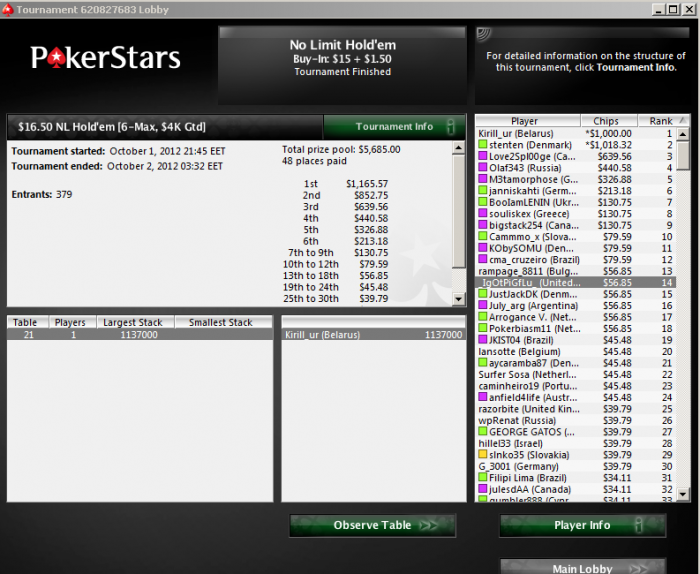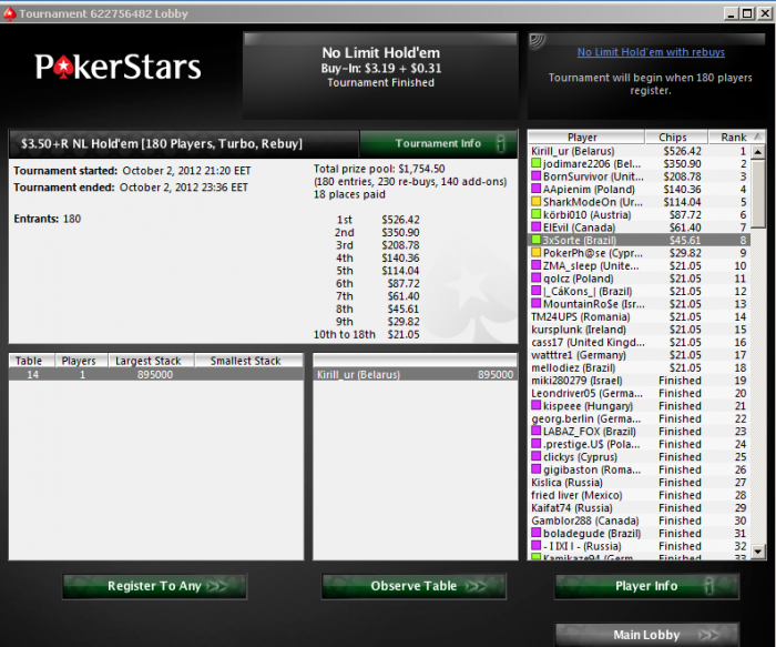 занёс турбинку 15$ 180 max, уже устал писать, что на скилле, но это действительно так), практически весь стек набил на высоких блинах пушами в лимп жирного фиша, раз 7 или 8 наверное, на баббле на финалку принял , скорее всего, дисповое решение- на СБ принял на AQs 2 пуша равных шортов на 70% своего стека, при том, что на 2-м столе тоже в это время двое ушли в аллын. В результате оба показали А3о, и финалка началась с 8 тел, и у меня был стек выше среднего. И вообще прихожу ко мнению, что игра на 1-е место более плюсовая, чем игра на ИТМ, по крайней мере в таких турбированных турнирах, где можно просто ,больше не дождаться такой руки как AQ