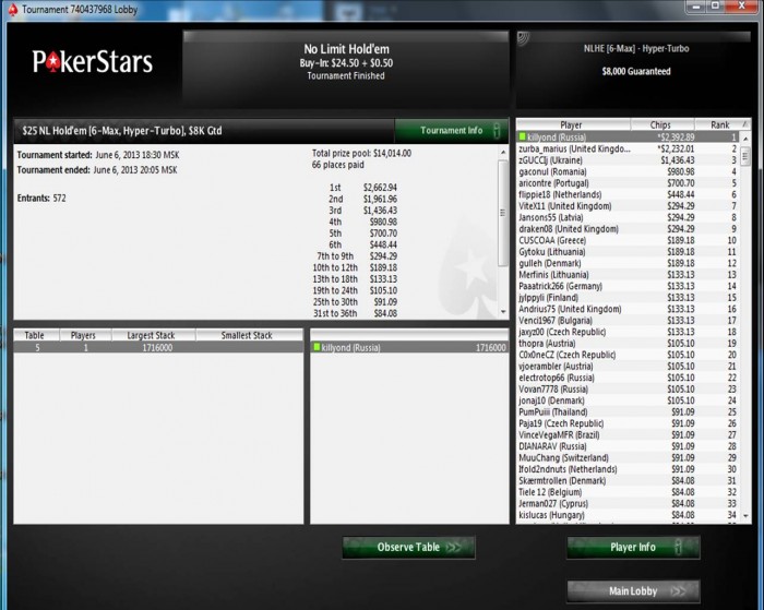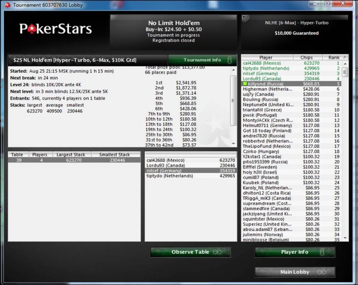 в посл время было много далеких проходов, вчера например в турике за 33 в топ27 выставился за 2,5-3 средних с кк в аа, сегодня утром на предфиналке турбинки за 16,5 вылетел, в ха гипертурбо по замазке баксов 100 проиграл)) по ЕВ 3. и думал ВОТ ОНО! раз в покер играть не умею, дак хоть лотерейку затащу! когда кол нажал, думал ура, привет тыщонка-две, но нет. :(