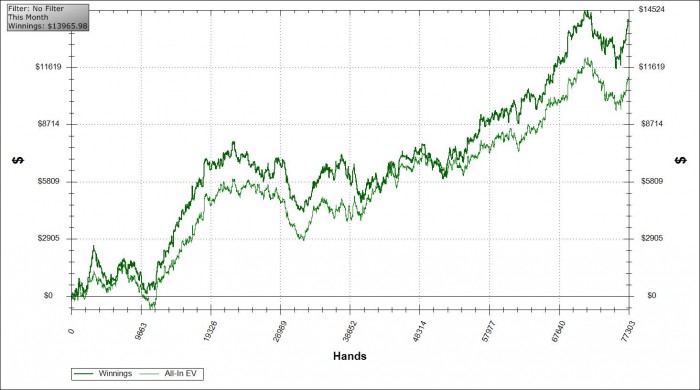 Смотрел вчера еще свои результаты за длинный период в разных ракурсах. И вроде как себя смог успокоить, что все хорошо на самом деле, хоть денег за год и не выиграл особо, но я сам в этом виноват, так как малость поймав апстрик и уверенность, решил, что смогу сокрушить все и вся и началась эта безселектовая замазка на 400-600 + хапы, да и я кардинально тогда изменил своему стилю, включив ураганный префлоп в 30/25/12, при этом не имея понятия как разбираться со всем трешем постфлоп + в этот период была просто тонна креатива. Сейчас же пришел к пониманию, что нафиг мне это не сдалось, тот кайф, что я получаю, когда просто сижу и стрегу капусту - намного круче. Ну и играю я далеко же не на автоматизме, все зарубы сохранились, просто стало все как-то поадекватней чтоли, брейнфаки себе и оппонентам пореже стал устраивать.