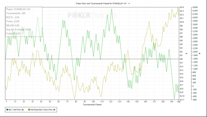 за 500 турниров может случиться что угодно, и это не повод искать какие то заговоры итд. Потому что их нет. Есть только соотношение скила к силе поля. Чем скил ниже, а поле сильней, тем меньше винрейт. Сорри что призвал капитана очевидность.
