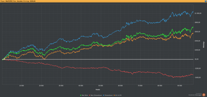 Сначала прилично апнуло, потом автомат решил забрать, но благодаря вдумчивой, хорошой игре на 6-и столах удалось сохранить нажитое. В конце виден провал по красной линии, обычно это бывает когда теряешь концентрацию. Но вчера это было не из-за меня а из-за складывающихся ситуаций. Трибеты не проходили против тех, против кого они часто должны проходить, к-беты все перекручивались или коллировались и т.п.