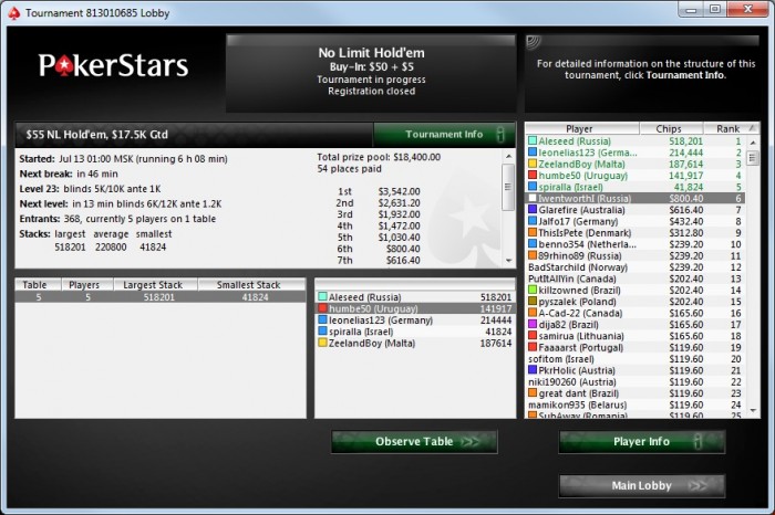 Poker Stars, $50 Buy-in (300/600 blinds, 50 ante) No Limit Hold'em Tournament, 8 Players