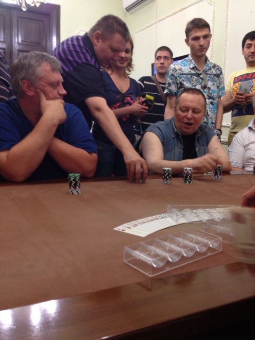 Вчера выдался очень веселый денек.К сожалению наш регулярный турнирчик перенесли и я решил пойти сыграть в клуб "Вивальди" турнир по 2000 рублей Double Shance.Взял с собой 3500 рублей наликом. Очень хотел поиграть в оффлайн, так как не играл почти с момента проведения отборочного на SPT. Время 18.00 и я уже за столом в предкушении начала катушки, причем организаторы сделали розыгрыш на два бесплатных места в турнире, кому выпадает старшая карта, то тот получает бесплатный стартовый стек, по мне так прикольно.Вот фотка вы посмотрите на эти лица, любителей халявы: