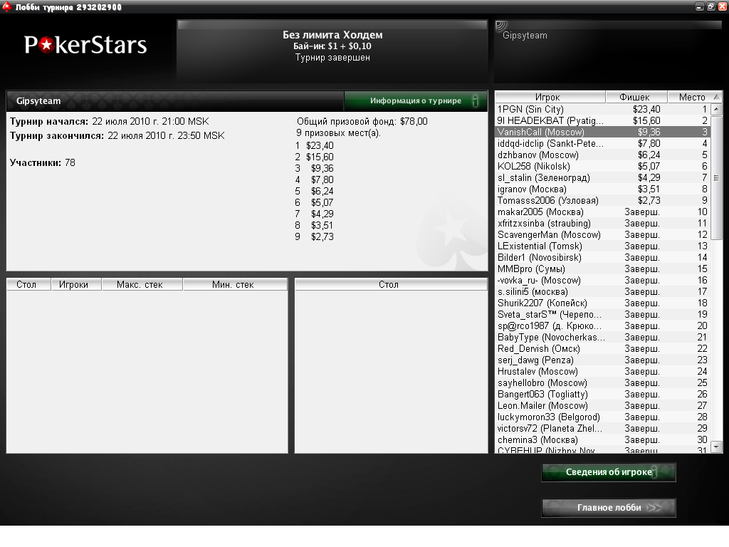 Потом ещё удвоился, в итоге вышел на финалку с 8-ым стеком... Удвоился, остались троем, проиграл AQ<AK на блайндах :( Очень обидно, были хорошие шансы на победу :( Саня занял второе, пришлось ему 5$ отдать + Большое спасибо Хулигану за поддержку