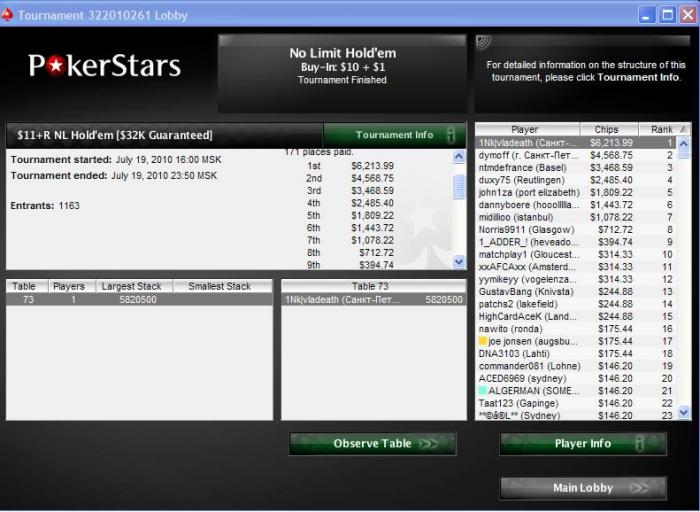 Poker Stars $10+$1 No Limit Hold'em Tournament - t3500/t7000 Blinds + t700 - 6 players - View hand 811908