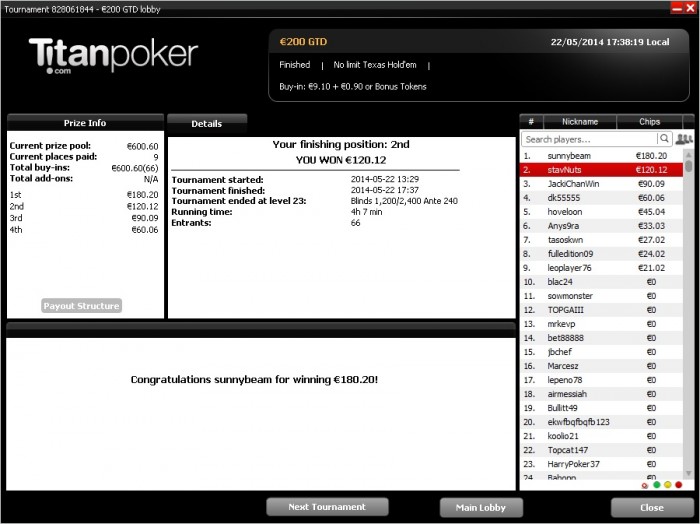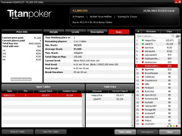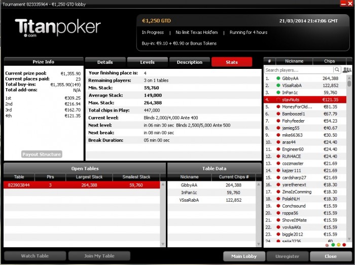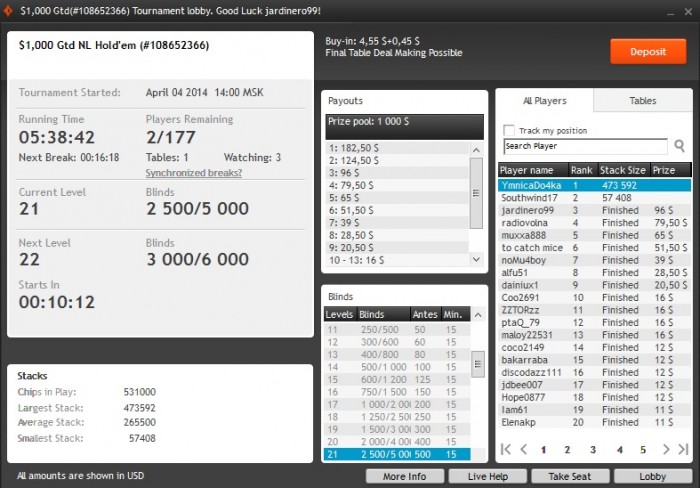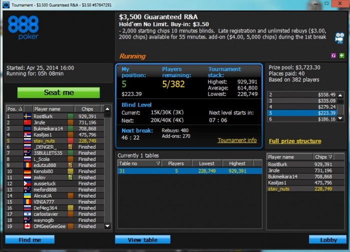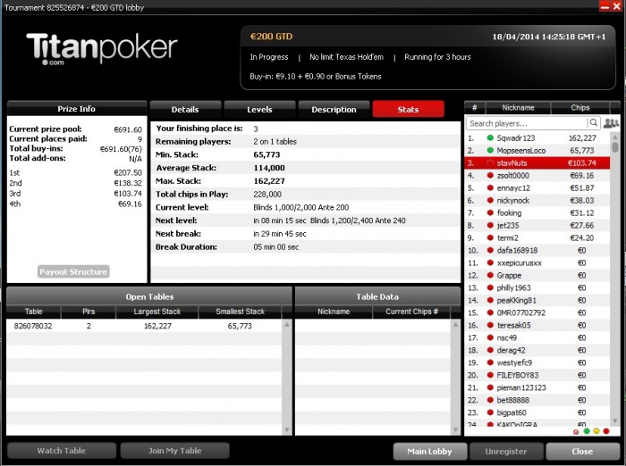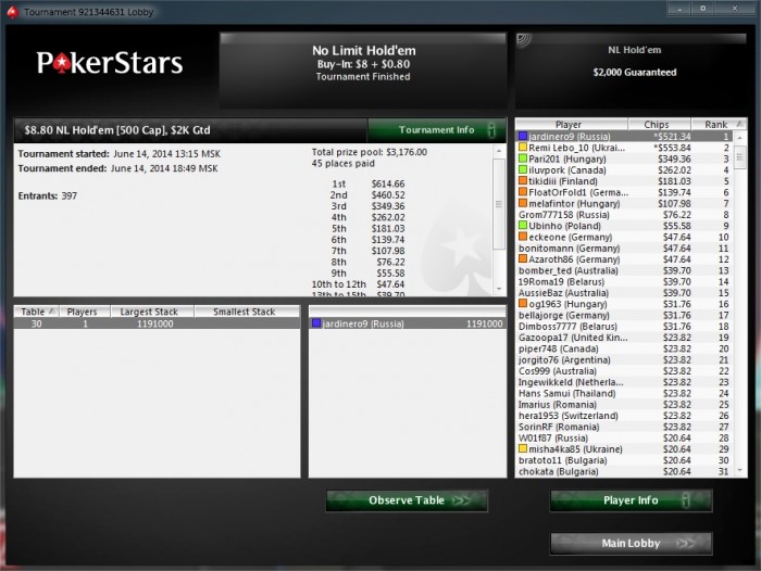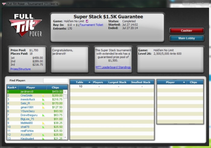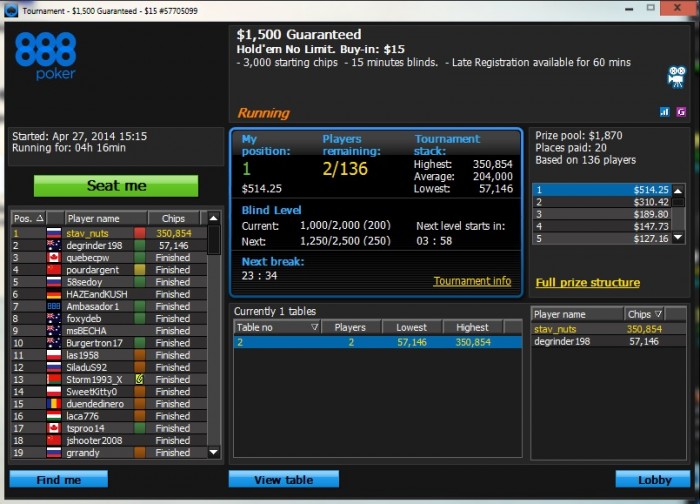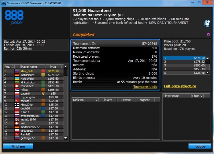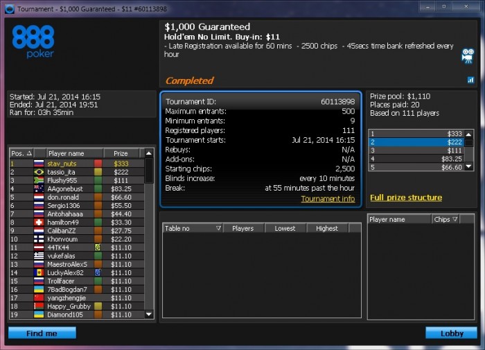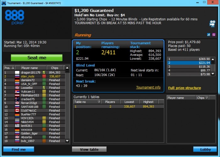 топ1. Признаюсь, финалку тащил на лаке но куда без удачи в покере. Меня даже фишом обзывали за столом. Весь день сегодня ездили, но под конец удалось втащить