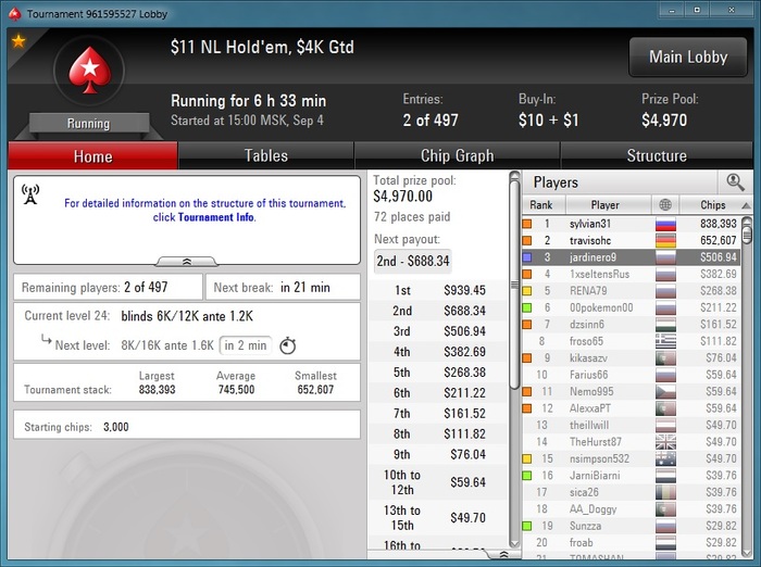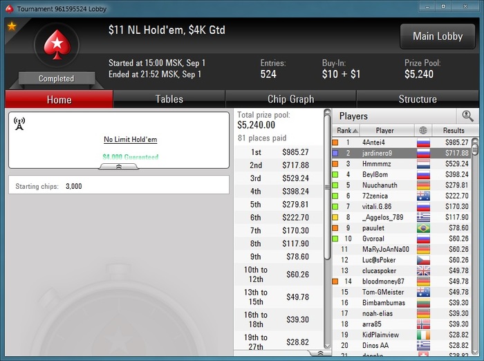 Долго не писал, был в разъездах) июль закончил не очень хорошо, +400 баксов всего)) играл только последние две недели августа. Тяжело катать две недели подряд без выходных. 1 сентября порадовало, люблю когда месяц начинается так. В ХА играл с сильным парнем, делить 50/50 он отказался и после долгого метания фишек туда-сюда я поплыл, тем более это был 12-ый час игры. Но я всё равно доволен, т.к. на старзах давно не могу ничего заработать.