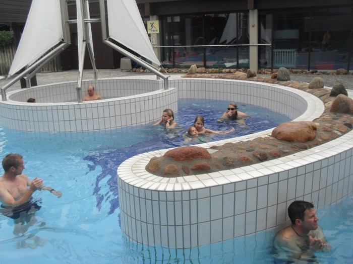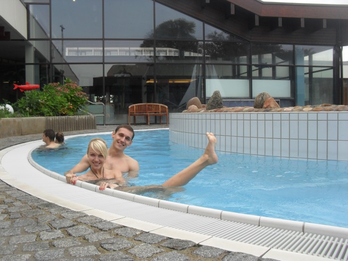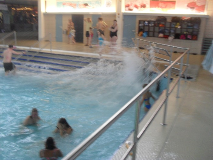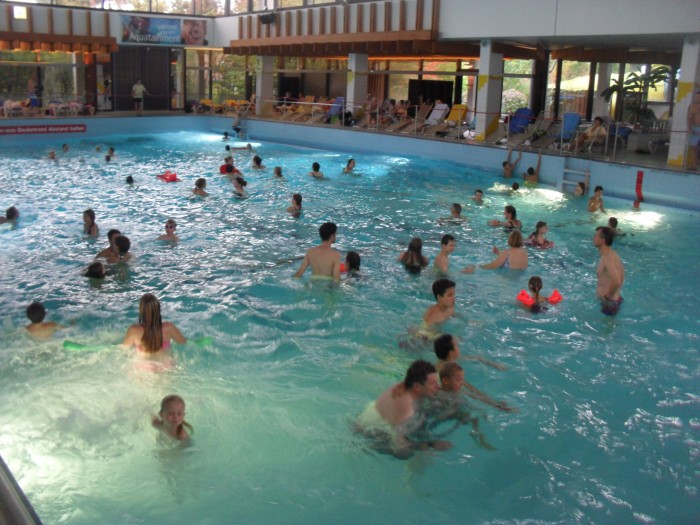 На следующий день в Германии мы решили поехать в Аквопарк. Серьезно настроились, это была суббота. Один из лучших аквопарков на Севере Германии находился в 50км от нашего города. Туда мы и отправились. Приехав туда, нас жестко обломали, так как сказали, что в выходные надо резервировать билеты. Так как вход ограничен. Сколько бы мы не уговаривали охранника, нас не пустили, сказали ,что аквопарк переполнен. С полным обломом мы отправились обратно в Люнебург. Мы уже настроились на поход в бассейн, а тут такое. По этому легким решением было пойти в бассейн Люнебурга. Это не большой комплекс с 3 бассейнами и горкой. Один из бассейнов с теплой водой выходил на улицу: