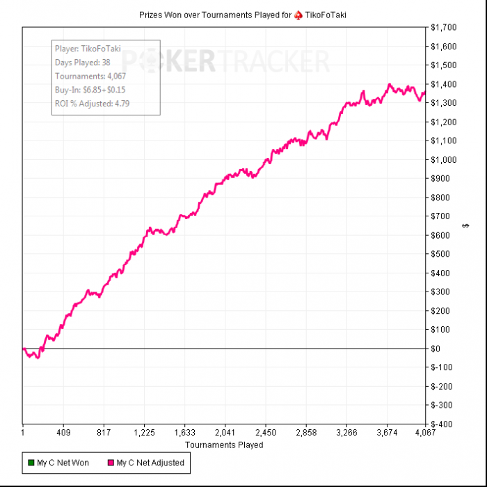 Итак, начал играть 15ки. 30го апреля сыграл 33 турнира, А так же сегодня(уже вчера) ещё 101. Если честно - думал поле сильнее. Я чувствую что основной проблемой является психология, так как игроки если не те же, то по уровню не многим лучше. Но часто бывает играю с меченными на 7$. Пока что отыграно 134 турнира. Главное справиться с волнением, сомнений в том что бью лимит - нет. ъ\