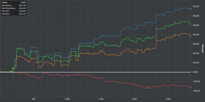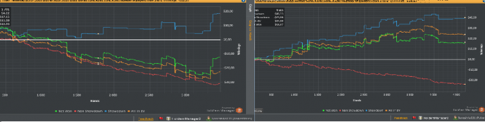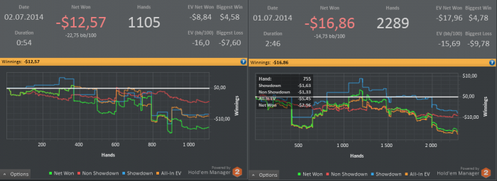 Вчера и сегодня. Щас БР = 143$... как только будет 200$ перехожу на нл10 12 столов. При просадке в 5БИ спускаюсь на нл5 и так доо бесконечности пока не наколочу 500$ для нл25. А про просадку на нл25 уже потом подумаю.