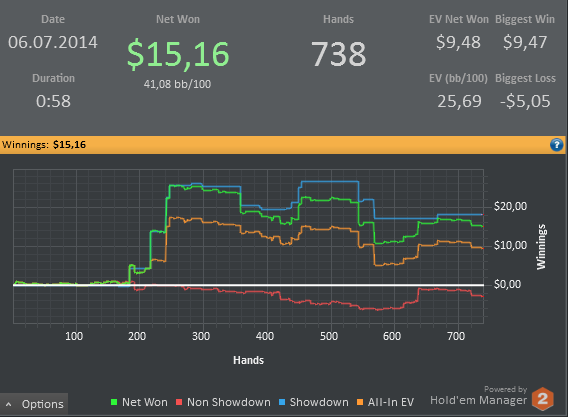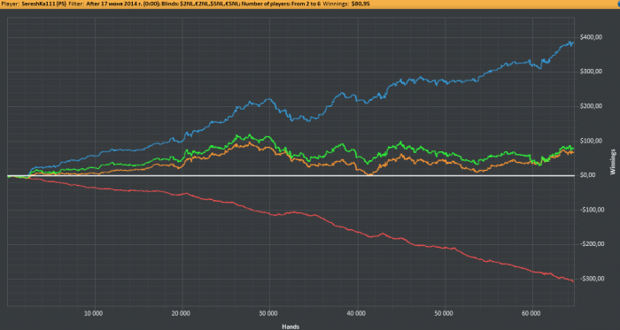 Lipskiy @ 4.7.2014 Вчера и сегодня. Щас БР = 143$... как только будет 200$ перехожу на нл10 12 столов. При просадке в 5БИ спускаюсь на нл5 и так доо бесконечности пока не наколочу 500$ для нл25. А про просадку на нл25 уже потом подумаю.