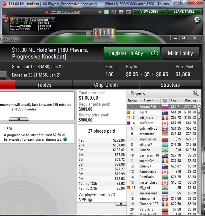 Poker Stars, $24.55 Buy-in (60/120 blinds, 15 ante) No Limit Hold'em Tournament, 9 Players