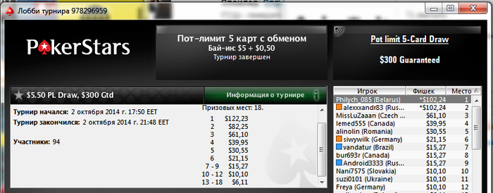 Сегодня старзы дали шанс в вечернем турике за $5,5, которым я толком и не воспользовался. Не лучшим образом отыграл в завязке против фишного опа и как итог 3-е место. Но уже лучше чем ничего, вчера игра была без шансов.