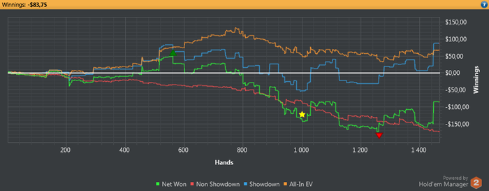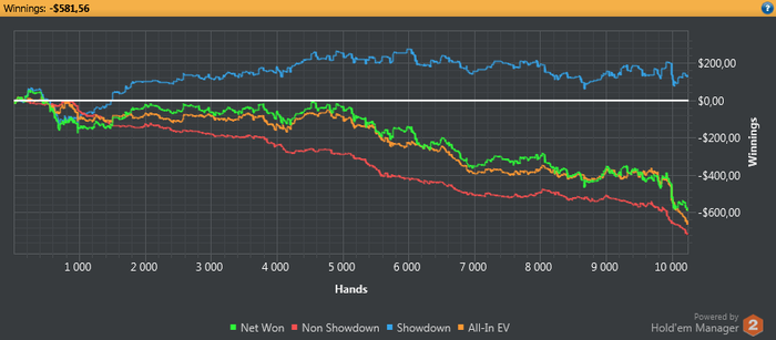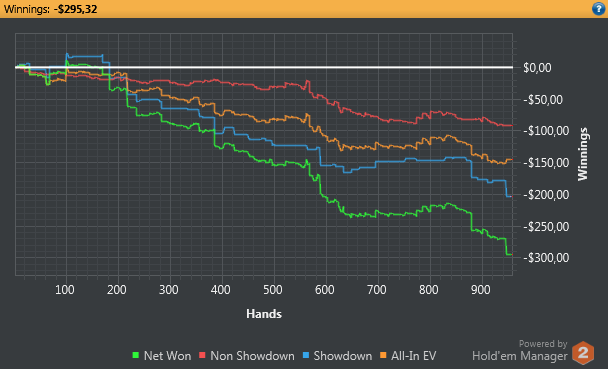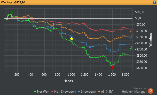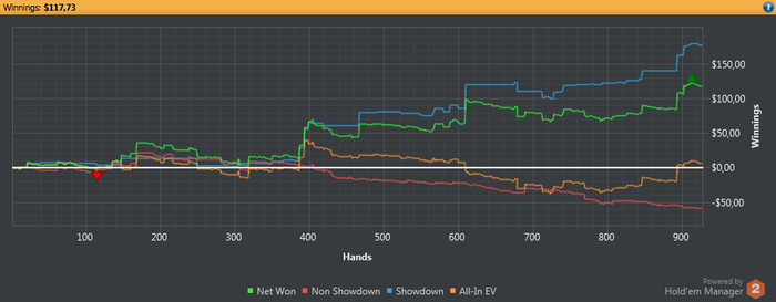 Играл более менее. Потом начал зарубаться с регами и в одной раздачи так тупо миссриднул руку) Выставился ривер 450бб банк по 9хай. думал стрит) И все..) поплыл окончательно.