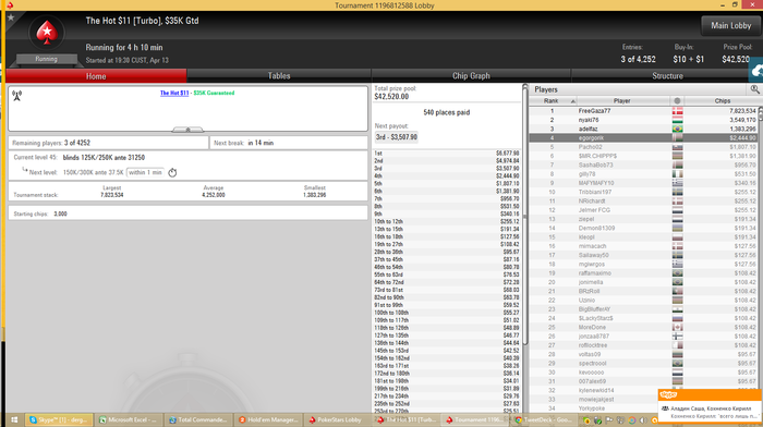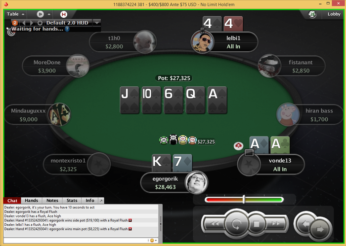 В пятницу был «интересный» случай, когда на Старзах всё подвисало. Я в это время играл нокаут за доллар. Всё шло относительно неплохо, собирая сеты и флэш-рояли я дошёл до ТОП-100, имея больше среднего стэка, но тут турнир остановился. И возобновляться, как оказалось, он не планировал. Мне выплатили 33 доллара – и всё. А за первое место было порядка 900. Походу поделили по ICM, но этому решению я реально не был рад, т.к. игра складывалась ипо ощущениям я мог затащить этот турнир.
