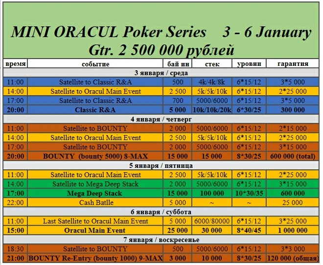 15:00 MAIN EVENT Re-Entry по 25 000 руб Гарантия 1 000 000 рублей _ стартовый стэк 30 000 _ стэк на Re-Entry 30 000 _ поздняя регистрация и период Re-Entry 8 уровней _ длительность уровней по 8*45/40 мин _ фуршет для участников турнира