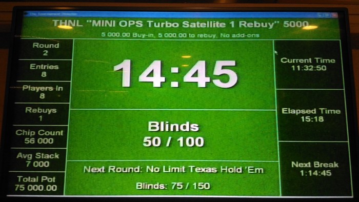 11:00 Turbo Satellite to Main Event в формате 1 Rebuy по 5 000 руб. Гарантия 75 000 (3 билета) _ стартовый стэк 6 000 _ стэк на Rebuy 8 000 _ поздняя регистрация 6 уровней _ Rebuy можно сделать тоько один раз в любой момент и на любое кол-во фишек в течении первых 6 уровней _ длительность уровней по 6*15/12 мин