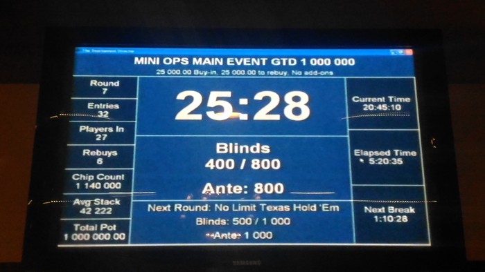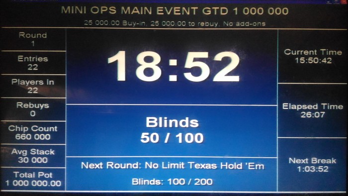 В 15:25 был дан старт MAIN EVENT Re-Entry по 25 000 руб Гарантия 1 000 000 рублей _ стартовый стэк 30 000 _ стэк на Re-Entry 30 000 _ поздняя регистрация и период Re-Entry 8 уровней _ длительность уровней по 8*45/40 мин _ фуршет для участников турнира