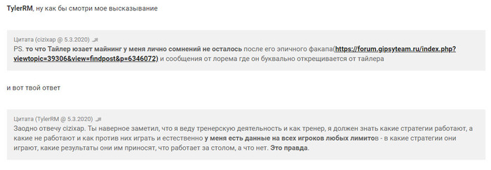 Тайлер, ты ВОТ ЭТО считаешь вырыванием фразы из контекста? =) тут же буквально "тайлер использует майнинг" "да, это правда" ну не может у тебя быть данных на всех игроков любых лимитов без использования истории рук скачанных с сервисов майнинга это ребенку очевидно. не знаю как у тебя с СБ старзов получится все, но это очевиднейшее признание в нарушении правил