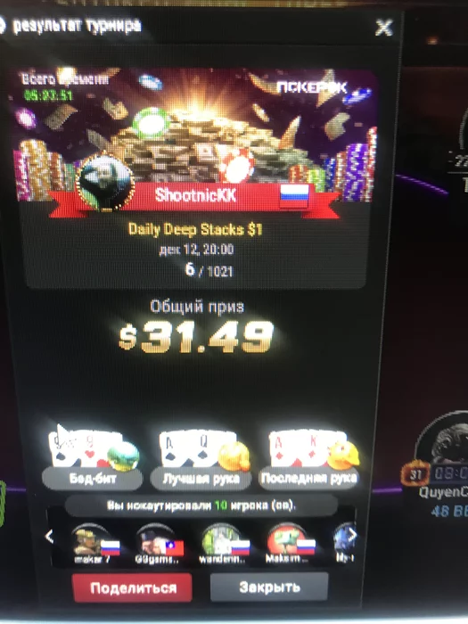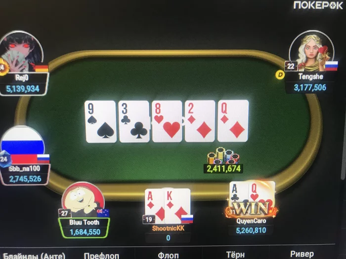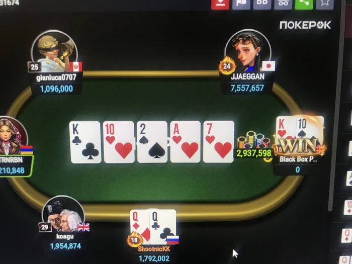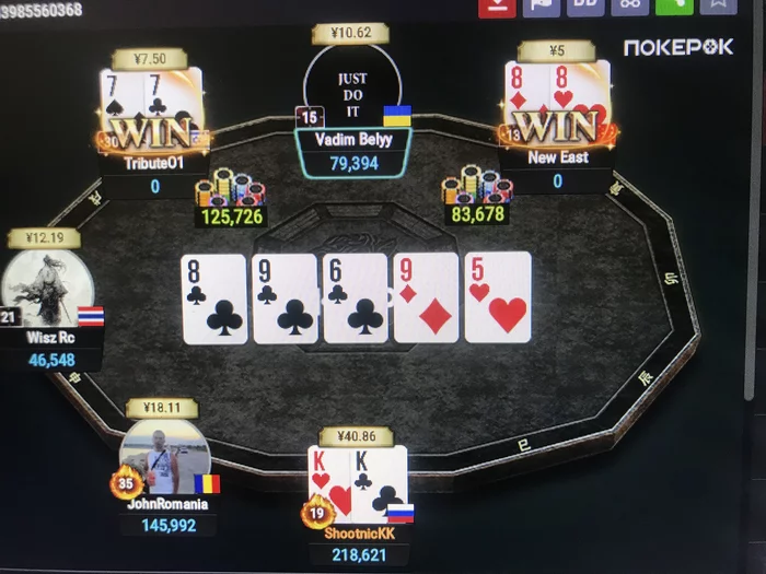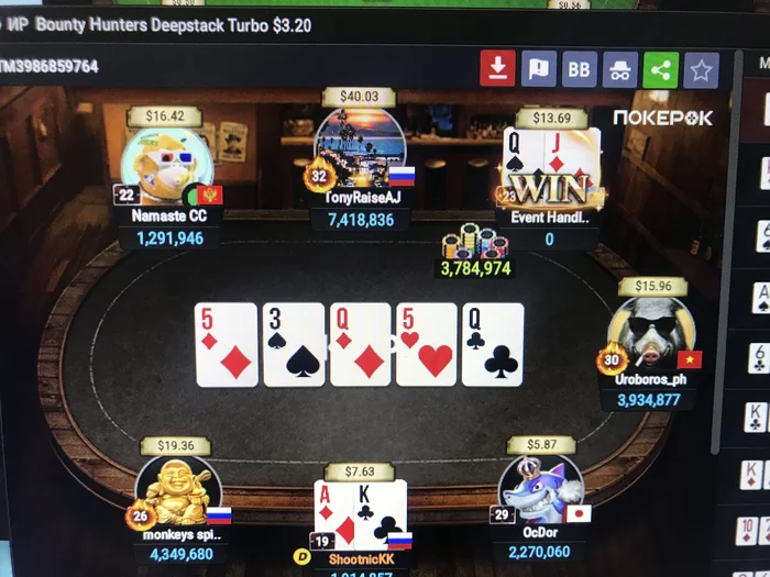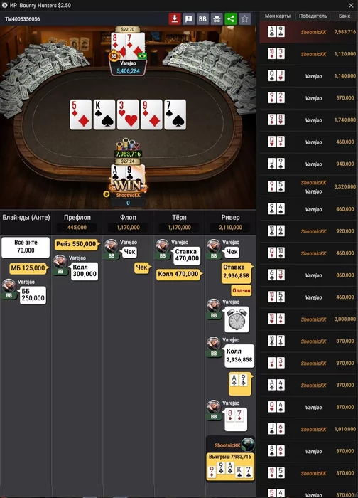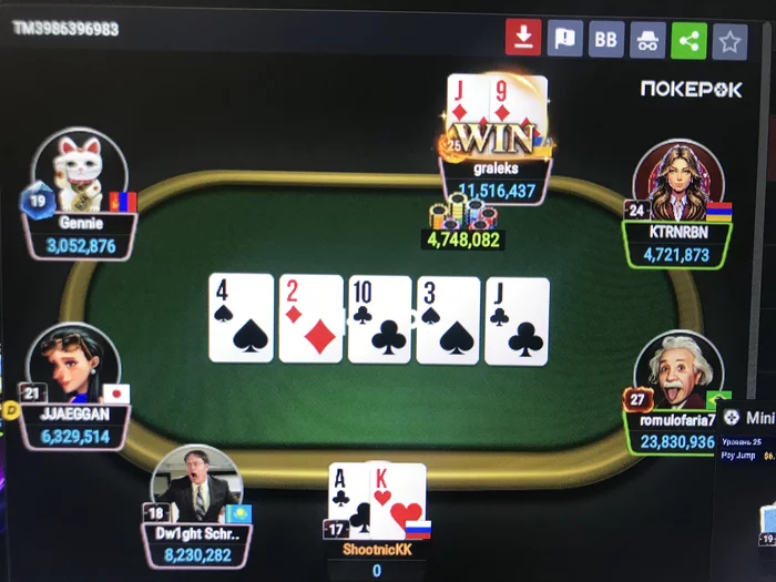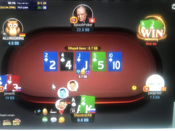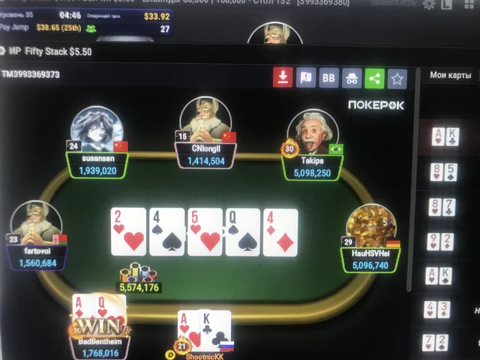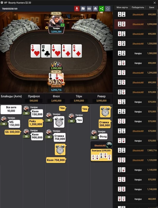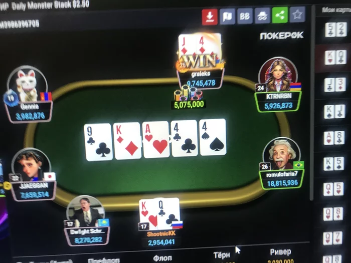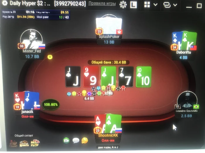 Ну и вот это было обидненько, за топ1 стек с запасом. Там ещё и верхний чувак J показал, так что этот всех возможных валетов выловил.