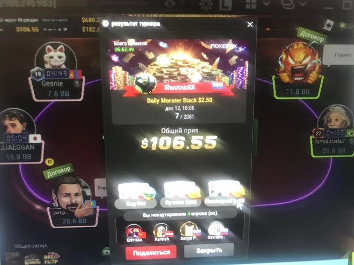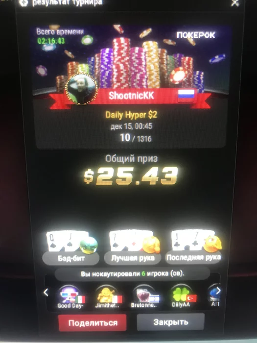 ГГ, твою мать. Сначала в самых дорогих турнирах нахреначил мне 86/14, 80/20 и т.д., а потом и вовсе завис напрочь.