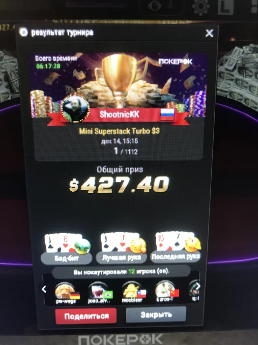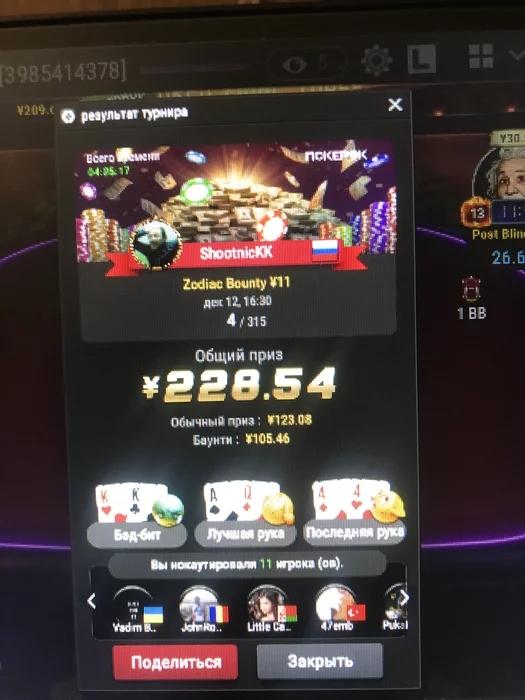 (Кроме этого турнира сессия отвратительная, АА в ТТ в самом дорогом, дважды сверху в еще одном таком же и куча остального дерьма, мтт такое мтт. Ну за итог спасибо. Хотя пока ощущения от дня отвратительные, как-то это не перекрыло (по эмоциям. по деньгам перекрыло), но, наверное, пройдёт.