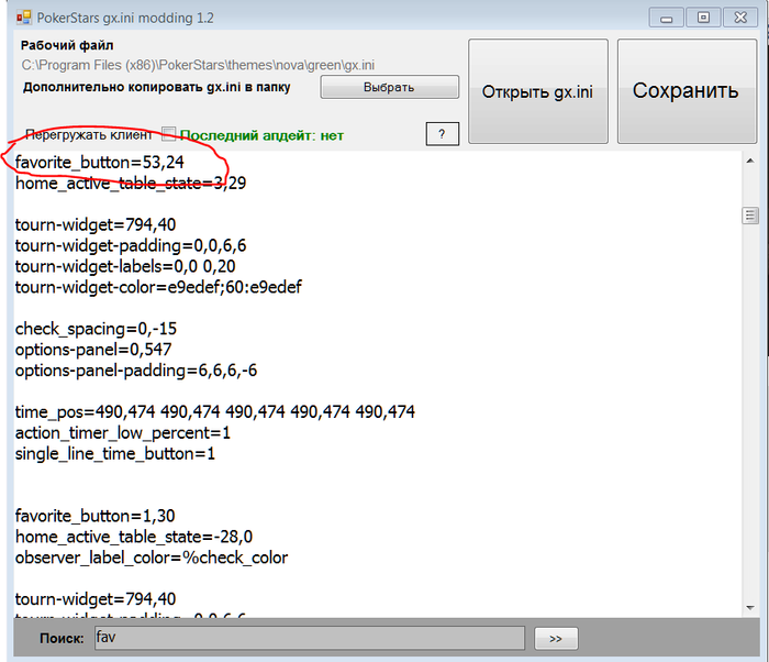 ну а если ты пытаешься переделать купленный комфорт6 под комфорт7, то в этом файле PokerStars\themes\nova\green\gx.ini замени координаты favorite_button= и размести его там где тебе удобно)