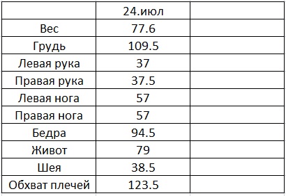 Сделал контрольные замеры. Отчеты по результатам будут раз в две недели. Фото до и после раз в месяц. До болезни весил в районе 80 кг, так что думаю организм вернется быстро к этой цифре. Задача набрать 84-85 кг. Срок 2,5-3 месяца. Набирать буду качественно, пустая масса мне не нужна.