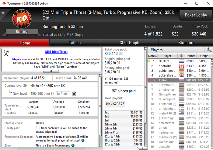 Вот поэтому я и не люблю никакие мтт, вот она двушка - рукой до неё подать, переигрывал всё поле, почти без риска поднялся до топ 10, и при 7 челах в хедзапе сдают кулер, и остаюсь коротышем, везет слегка удваиваюсь, но следующий флип не тащится. И всё. В итоге получите свой говноприз.